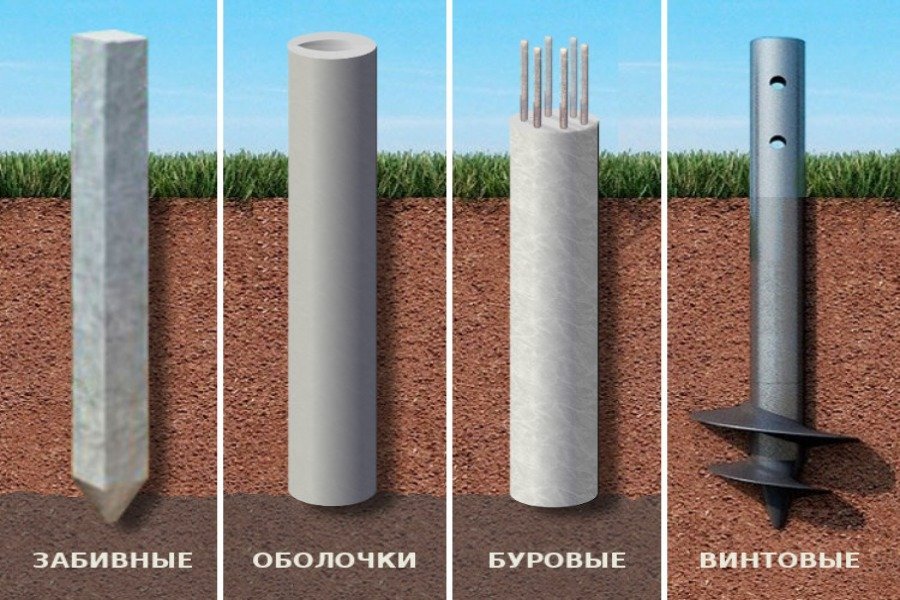 Фундамент в виде ж/б свай. Это лучшее решение при возведении дома на слабом грунте. Такое основание подходит для всех типов почвы, кроме скальной породы. Они имею много типов, для установки некоторых из них даже не нужна строительная техника.